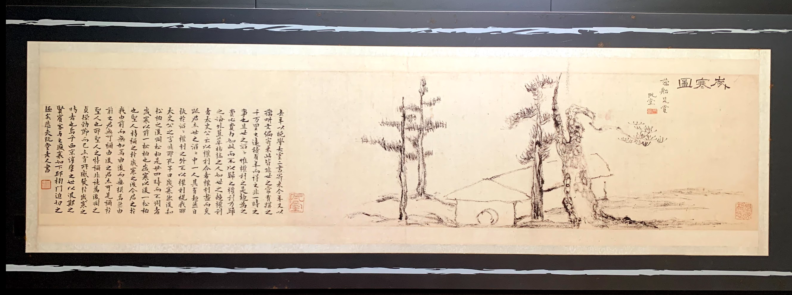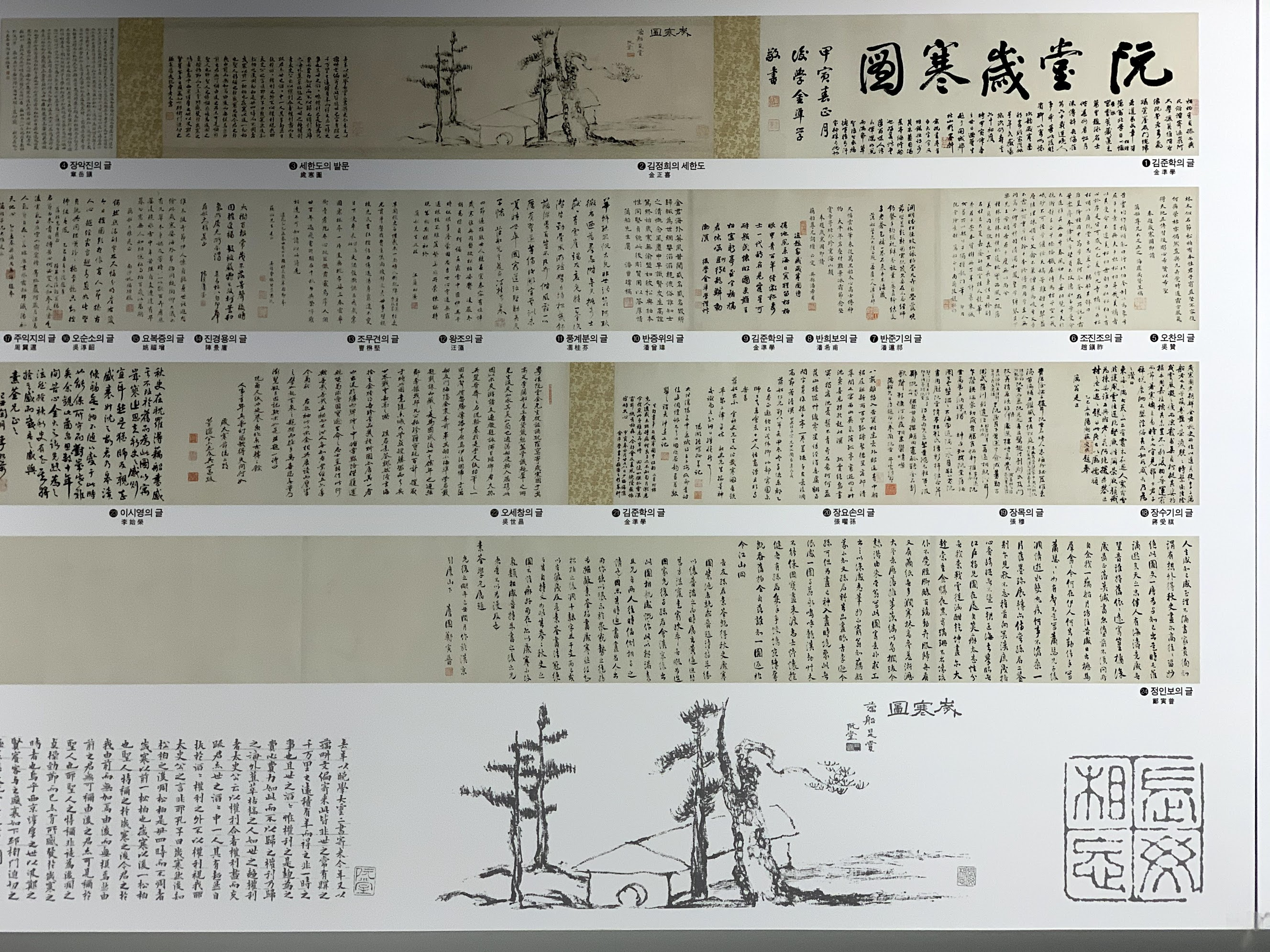 세한도는 1844년 제주도 이 자리에서 제작되어 이후 여러 사람의 손길을 거쳐 최종적으로 2020년에 손창근 선생이 국중박에 기증하였다. 제주도 --> 조선 --> 중국 --> 일본 --> 한국 이렇게 장소만 해도 여러 곳을 거쳤으며, 이 세한도에 여러 사람이 감상평을 덧붙여, 엄청 긴 두루마리가 되어 버렸다고 한다. (한국과 중국의 문인 20명이 22편의 감상글을 써서, 전체 길이가 14.7m에 이른다고..)