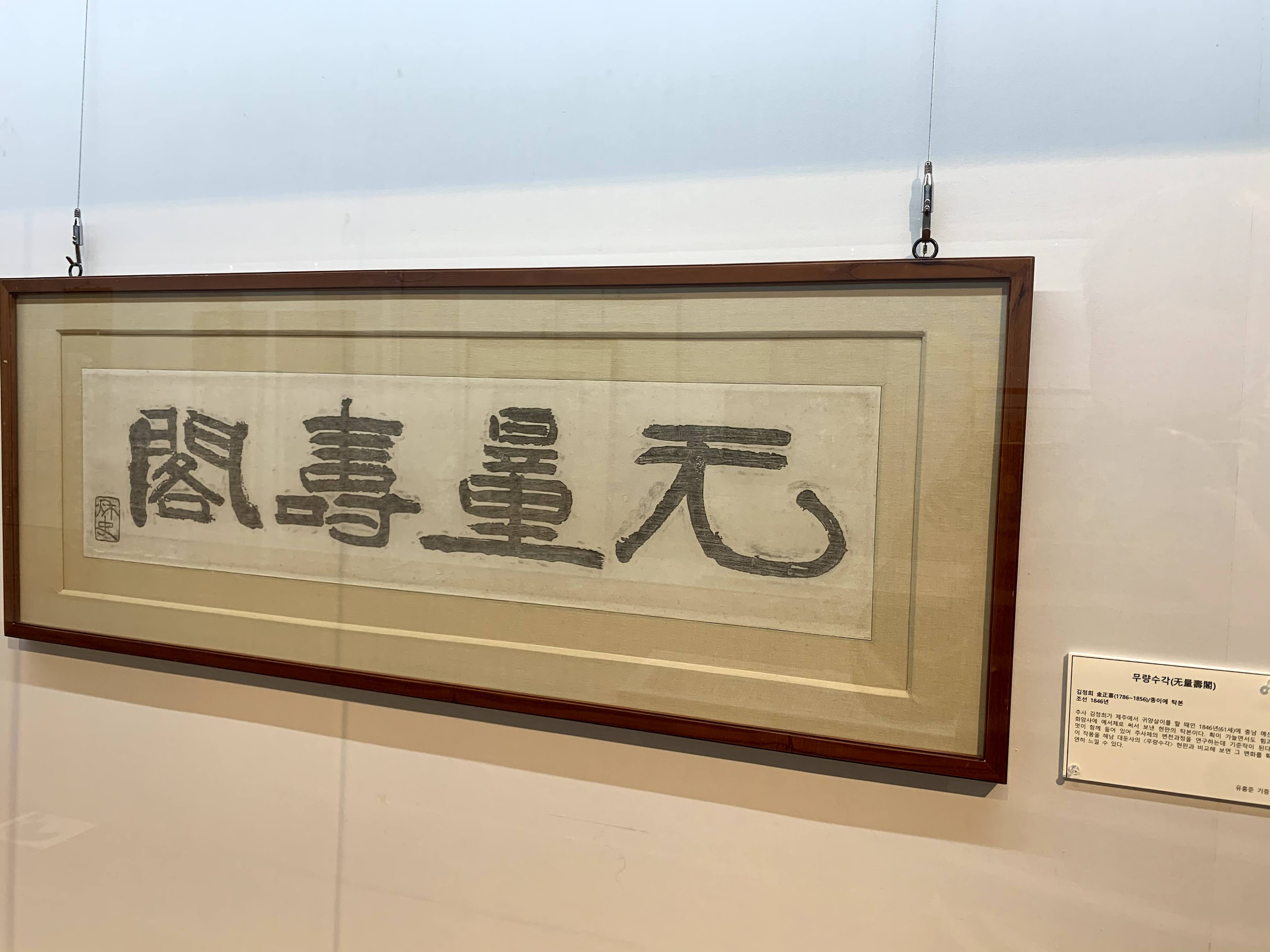 귀양살이 중간인 1846년 61세에 충남 예산 화암사에 예서체로 써서 보낸 현판 글씨 탁본. '무량수각'