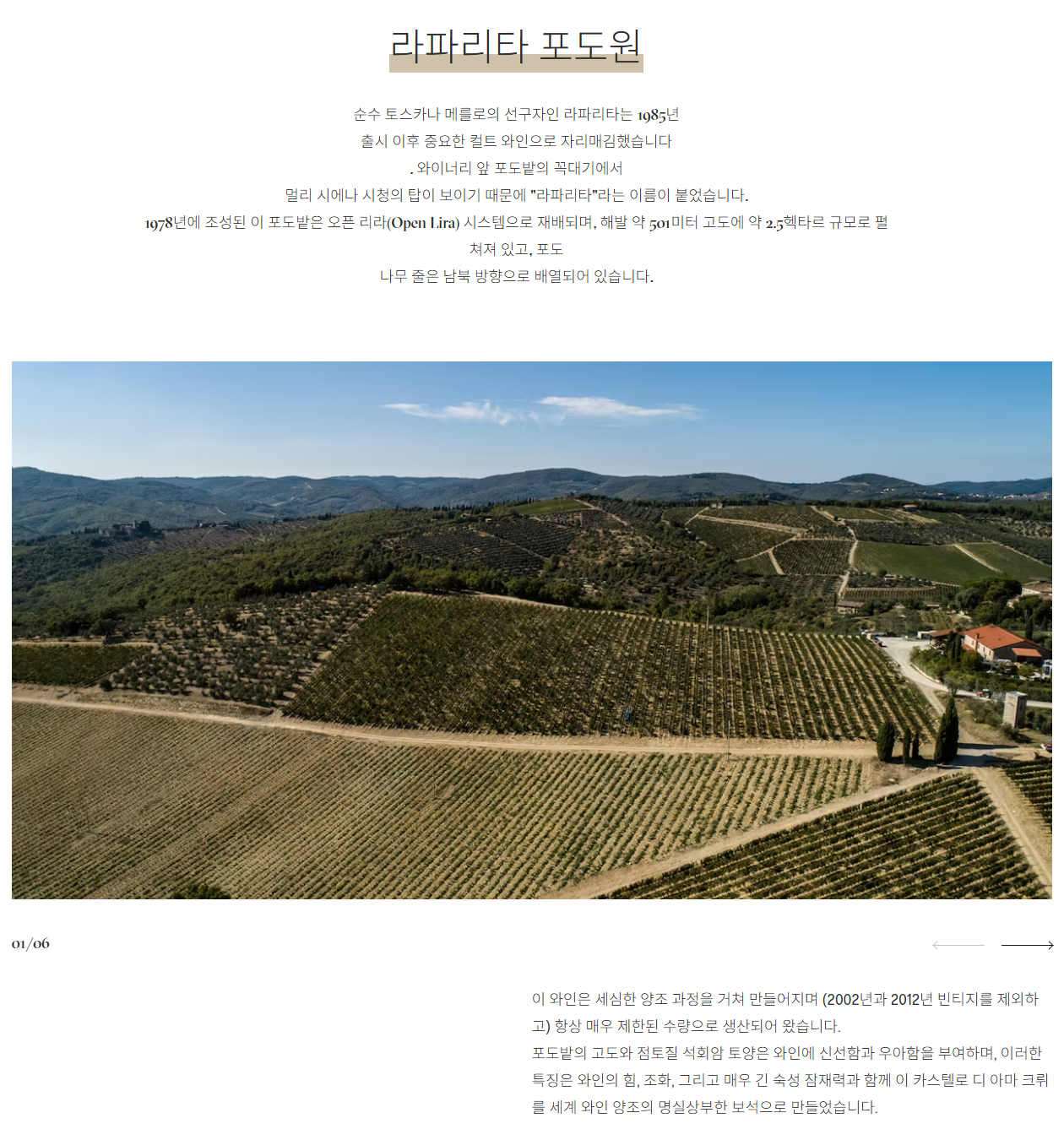L'Apparita (내륙/키안티 클래시코): 해발 490~530m의 고지대인 가이올레 인 키안티(Gaiole in Chianti)에서 생산됩니다. 높은 고도와 점토질 토양의 영향으로 신선한 산도와 우아한 미네랄리티가 강조되며, 마세토에 비해 상대적으로 섬세하고 날렵한 바디감을 보여줍니다.